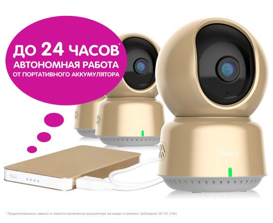 • Питание камеры (детского блока) возможно от сети или от обычного портативного аккумулятора (Power Bank, объём 10 000 mAh обеспечивает автономную работу камеры до 24 часов, продолжительность зависит от режима и интенсивности использования, разъём питания камеры USB Type-C, для подключения к портативному аккумулятору можно использовать кабель от адаптера питания из комплекта).