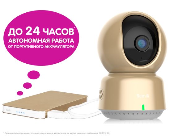 Видеоняня Ramili работает от сети или от обычного портативного аккумулятора (Power Bank, объём 10 000 mAh обеспечивает автономную работу камеры до 24 часов, продолжительность зависит от интенсивности и режима использования);
