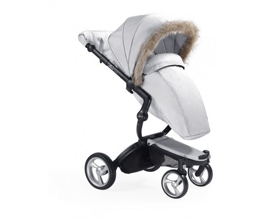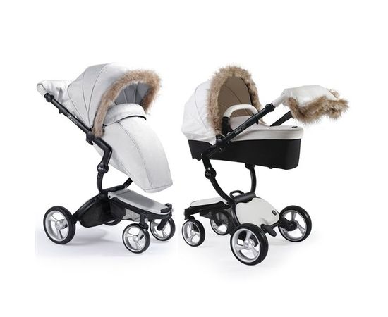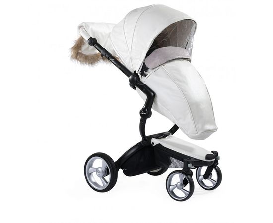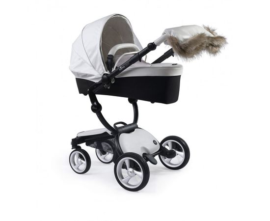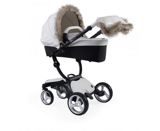 - Муфта зимнего набора Mima Winter Outfit просто укладывается на сидение, а крепится меховым краем, который оборачивается вокруг бампера и ремешками с пуговицам. Они оборачиваются вокруг мест крепления ручки для малыша.